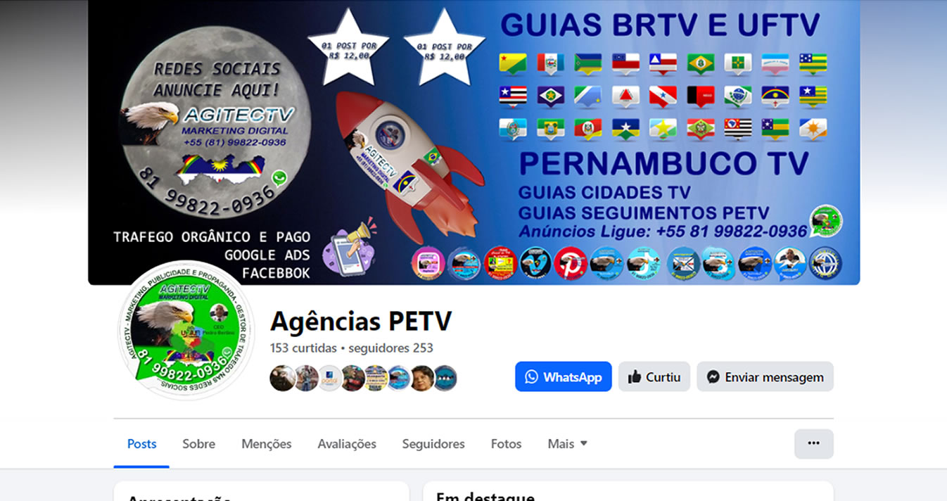 Anúncio do seu Post na Capa Topo da Página e do Grupo, com a Foto do Perfil do Guia Serviços PETV, + 01 Post na 1ª Postagem e no 1º Destaque no Guia do Seguimento PETV que você escolher ser Visto, por um Período de 30 Dias.