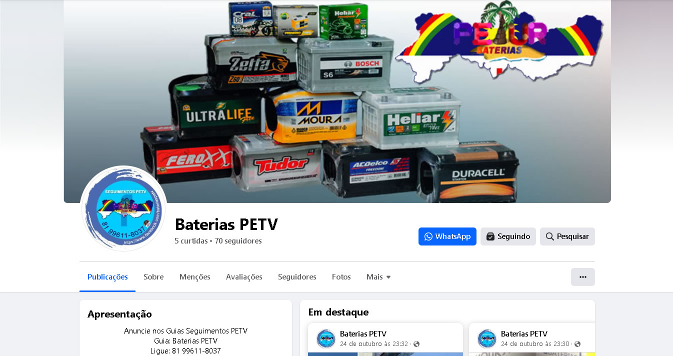 Anúncio do seu Post na Capa Topo da Página e do Grupo, com a Foto do Perfil do Guia Baterias PETV, + 01 Post na 1ª Postagem e no 1º Destaque no Guia do Seguimento PETV que você escolher ser Visto, por um Período de 30 Dias.