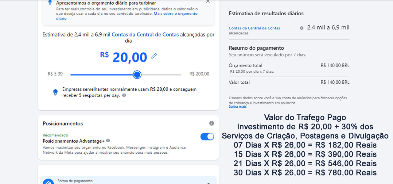 Escolha a Opção de Trafego Pago a Partir de 07 Dias a um valor de R$ 20,00 Valor de Investimento com + 30% Cobrança dos Serviços de Criação, Postagem e Divulgação do seu Anúncio da P&P do seu Post no TP, onde vai gerar visitas entre 2.400 a 6.900 Visitantes Diários ao seu Post em Média de 4.650 Visitantes e Possíveis Clientes por Dia, Relatórios Semanais e ao Final de Cada Plano.