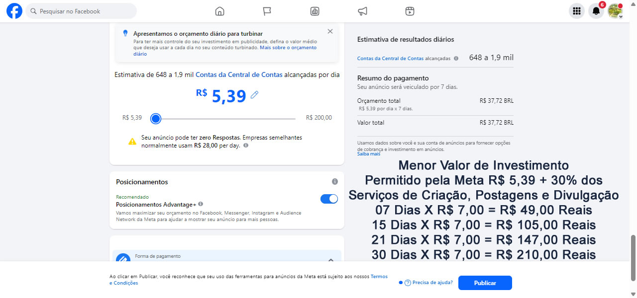 Escolha a Opção de Trafego Pago a Partir de 07 Dias a um valor Inicial de R$ 5,39 que é o Menor Valor de Investimento Permitido pela Meta + 30% Cobrança dos Serviços de Criação, Postagem e Divulgação do seu Anúncio da P&P do seu Post no TP, onde vai gerar visitas entre 648 a 1900 Visitantes Diários ao seu Post em Média de 1.274 Visitantes e Possíveis Clientes por Dia, Relatórios Semanais e ao Final de Cada Plano.